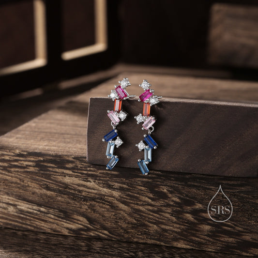 Rainbow CZ Cluster Stud Drop Earrings in Sterling Silver, Silver or Gold, Geometric Baguette Cluster Earrings, CZ Long Drop Earrings