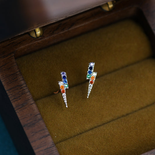Rainbow Lightning Bolt Stud Earrings in Sterling Silver, Silver or Gold, Lightning Bolt Earrings