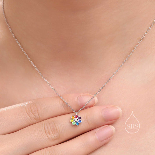 Enamel Smiling Flower Pendant Necklace in Sterling Silver, Silver Rainbow Flower Necklace, Tiny Multi Colour Flower Necklace