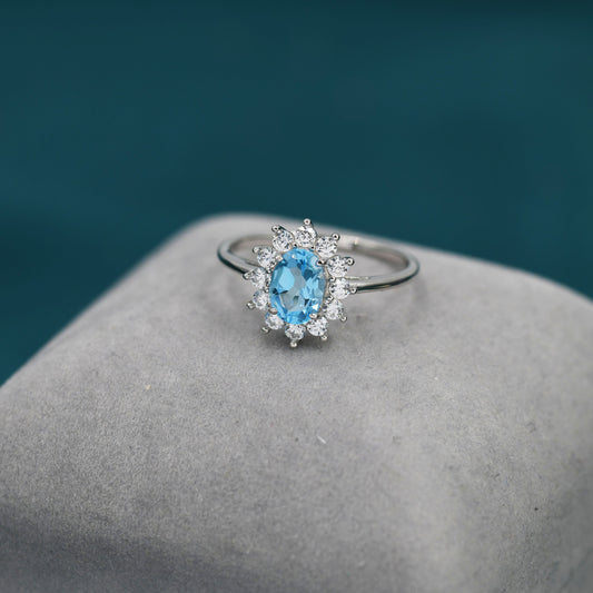 Genuine Swiss Blue Topaz and CZ Halo Ring in Sterling Silver, Natural Topaz Stone Ring, Stacking Rings, US 5-8