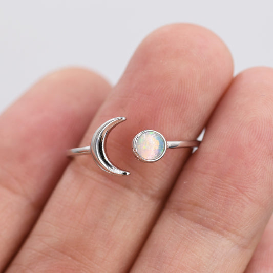 Sterling Silver Opal Moon Ring, Full Moon and Cresent Moon, Adjustable Sized Ring, Open Ring, Stacking Rings