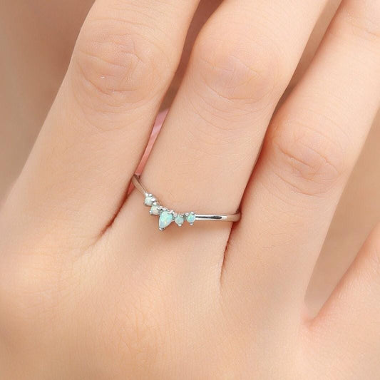 White Opal Chevron Ring in Sterling Silver, Fire Opal Crown Ring, Lab Opal Tiara V Ring, Adjustable Size, Nesting Band, Curved Wedding Ring