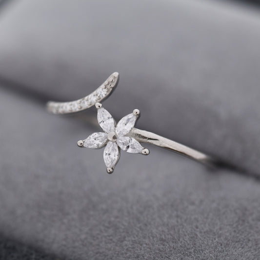 CZ Flower Open Ring in Sterling Silver, Silver or Gold, Adjustable, Forget-me-not, Minimalist CZ Ring