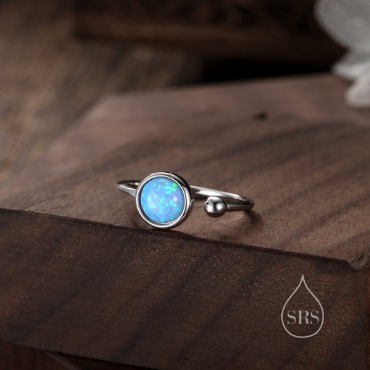 Blue Opal Open Ring in Sterling Silver, 6mm Lab Opal Stone, Bezel Set Simulated Blue Opal Ring, Adjustable Size