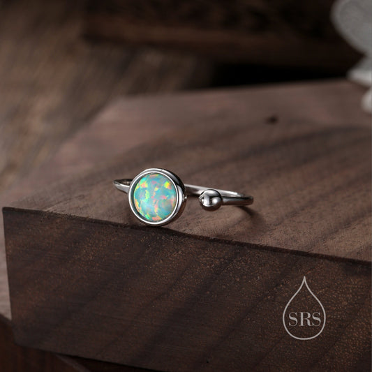 Aqua Green Opal Open Ring in Sterling Silver, 6mm Lab Opal Stone, Bezel Set Simulated Blue Opal Ring, Adjustable Size