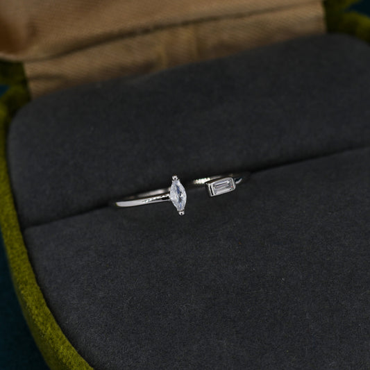 CZ Marquise and Baguette Open Ring in Sterling Silver, Silver or Gold, Adjustable, Geometric Minimalist CZ Ring