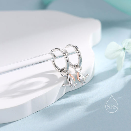 Sterling Silver Minimalist Robin Bird Dangle Huggie Hoops, Two Tone Robin Hoop Earrings, Dainty Dangle Earrings, Robin Bird Earrings