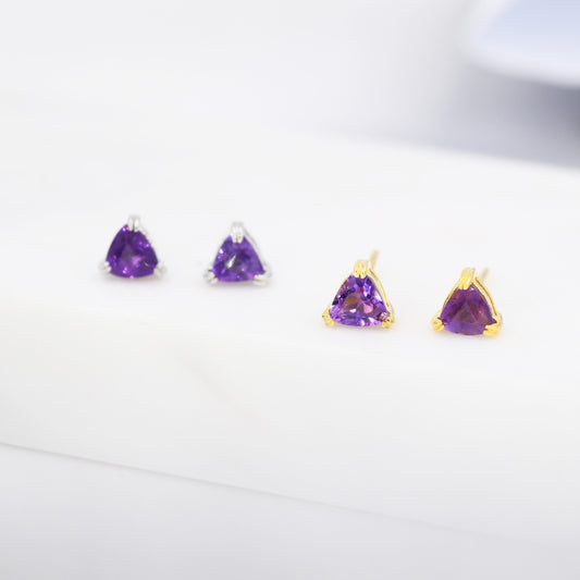 Genuine Amethyst Stud Earrings in Sterling Silver, Silver or Gold, Trillion Cut Purple Amethyst Earrings, Double Pronged