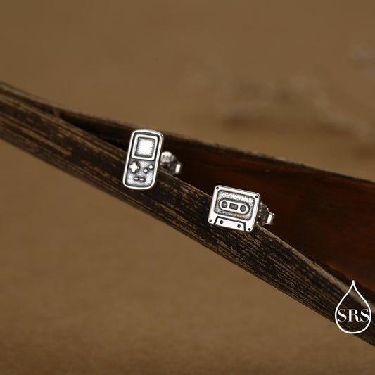Sterling Silver Retro Game Console & Music Cassette Tape Stud Earrings, Mismatched 90s Nostalgic Jewellery, Silver, Gold or Rose Gold Finish
