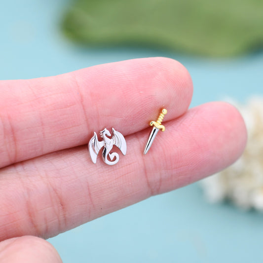 Mismatched Dragon and Sword Stud Earrings in Sterling Silver, Asymmetric Dragon Earrings