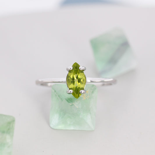 Genuine Green Peridot Crystal Ring in Sterling Silver, Natural Marquise Cut Peridot Stone Ring, Stacking Rings, US 5-8