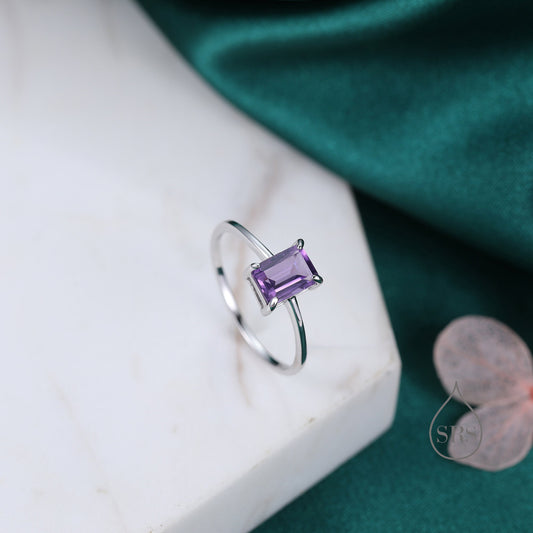 Genuine Emerald Cut Amethyst Ring in Sterling Silver, Natural Amethyst Stone Ring, Stacking Rings, US 5-8