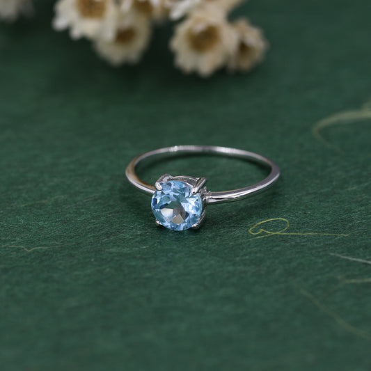 Genuine Swiss Blue Topaz Ring in Sterling Silver, Natural Brilliant Cut 6mm Topaz Stone Ring, Stacking Rings, US 5-8