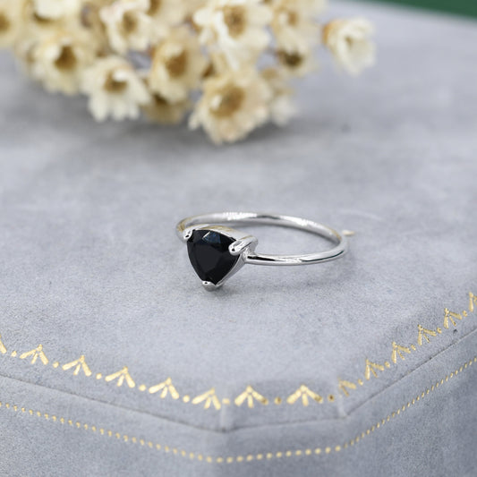 Genuine Black Onyx Ring in Sterling Silver, Natural Trillion Cut Onyx Ring, Stacking Rings, US 5-8
