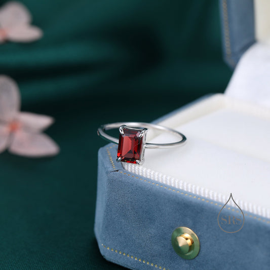 Genuine Emerald Cut Garnet Ring in Sterling Silver, Natural Garnet Stone Ring, Stacking Rings, US 5-8