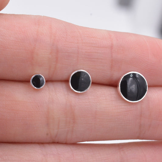 Sterling Silver Minimalist Round Dot Black Enamel Stud Earrings Unisex Round Circle Coin Design, Geometric,
