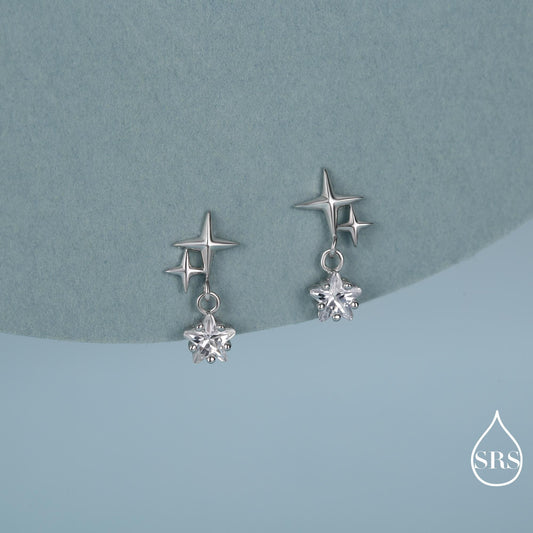 Tiny Star and Dangle CZ Stud Earrings in Sterling Silver, Silver or Gold, Aurora Star Earrings, Sunburst Earrings, Celestial