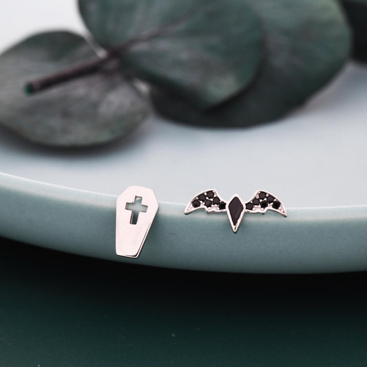Mismatched Coffin and Bat Stud Earrings in Sterling Silver, Silver or Gold, Asymmetric Bat and Coffin Cross Earrings, Vampire Earrings