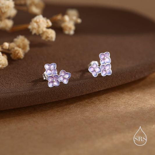 Purple Enamel Hydrangea Flower Bouquet Stud Earrings in Sterling Silver, Enamel Flower Earrings