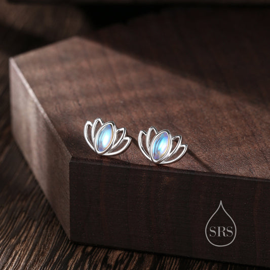 Lotus Flower Moonstone Stud Earrings in Sterling Silver, Silver or Gold, Lab Moonstone Lotus Earrings, Nature Inspired, Botanical Earrings