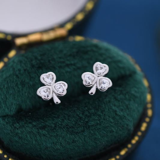 CZ Shamrock Tiny Stud Earrings in Sterling Silver, Clover Earrings, Irish Earrings, Silver or Gold Flower Earrings