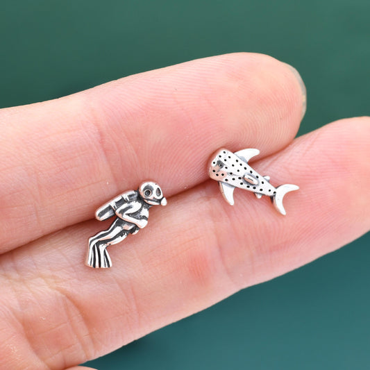 Mismatched Scuba Diver & Whale Shark Stud Earrings In Sterling Silver – Ocean Inspired Asymmetric Earrings, Minimalist Sea Life Jewellery