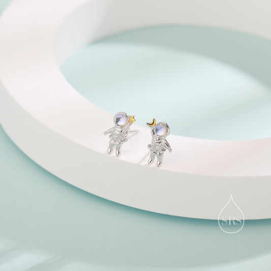 Astronaut Stud Earrings in Sterling Silver with Moonstone, Mismatched Moon and Star Astronaut Earrings, Asymmetric Spaceman Earrings