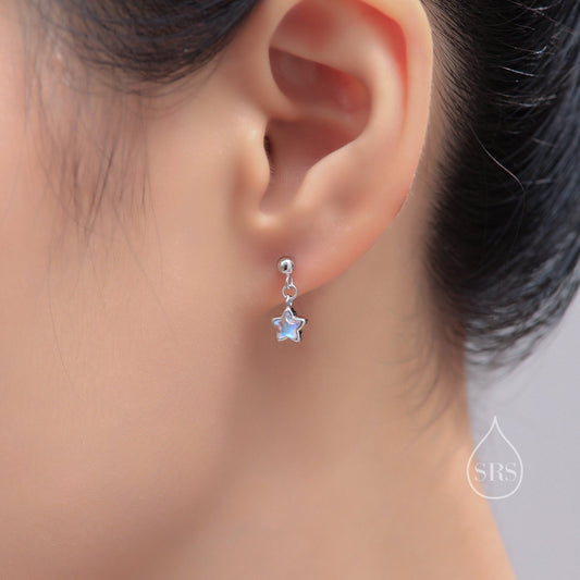 Tiny Moonstone Star Dangle Stud Earrings in Sterling Silver, Silver or Gold, Aurora Star Earrings, Sunburst Earrings, Celestial