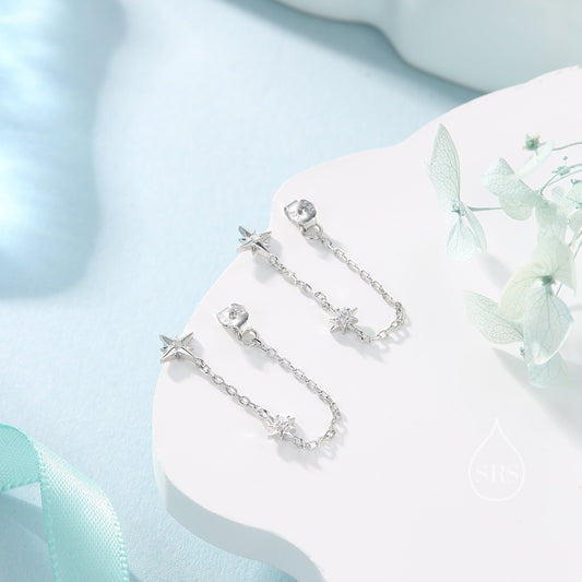 Starburst CZ Dangle Chain Stud Earrings in Sterling Silver, Silver, Gold or Rose Gold, North Star Earrings, Star Ear Jacket