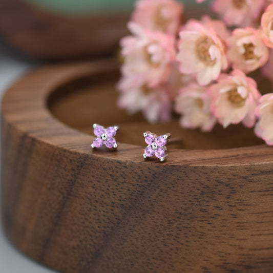 Pink Hydrangea Tiny Stud Earrings in Sterling Silver - 3mm Flower Stud, Pink Flower CZ Stud