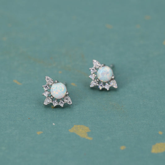 Vintage Inspired White Opal Flower CZ Stud Earrings, Lab Opal Halo CZ Earrings, Simulated Fire Opal Earrings