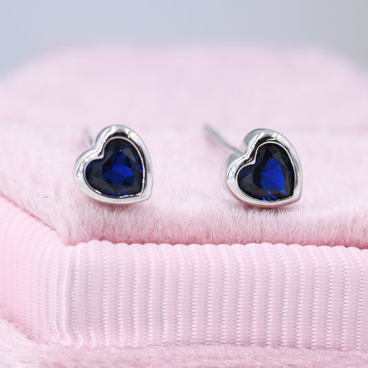 Tiny Sapphire Blue CZ Heart Stud Earrings in Sterling Silver, Silver or Gold, Blue Crystal Heart Earrings, Stacking Earrings