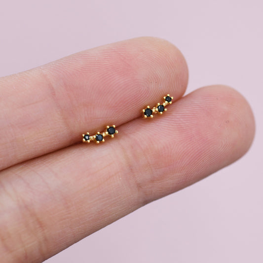 Extra Tiny Black CZ Trio Stud Earrings in Sterling Silver, Silver or Gold, Geometric Tiny Three Star CZ Earrings, Stacking Earrings