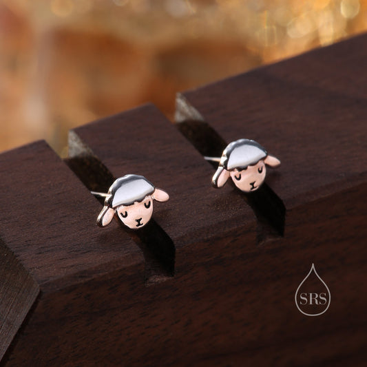 Two Tone Sheep Stud Earrings in Sterling Silver, Fluffy Sheep Face Earrings, Nature Inspired Sheep Head Earrings, Pet Lover