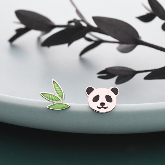 Mismatched Bamboo and Panda Leaf Stud Earrings in Sterling Silver, Asymmetric Panda and Bamboo Leaf Earrings, Nature Inspired