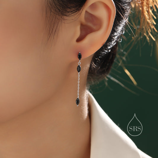 Asymmetric Marquise Black CZ Dangle Drop Stud Earrings in Sterling Silver, Marquise CZ Leave Earrings, Tree Branch Nature Inspired Design