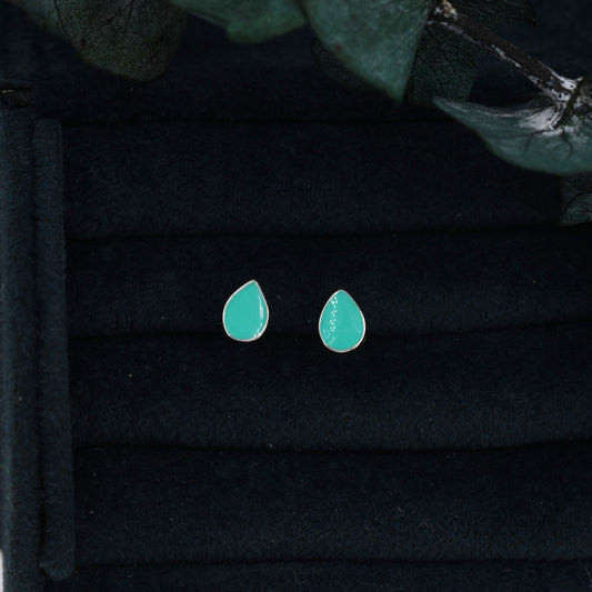 Teal Green Droplet Dot Stud Earrings in Sterling Silver with Hand Painted Enamel, Pastel Stud, Enamel Droplet, Drop Shape