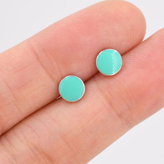 Teal Green Circle Dot Stud Earrings in Sterling Silver with Hand Painted Enamel, Pastel Stud, Enamel Dot, 6mm