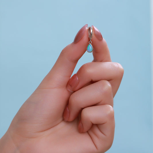 Sterling Silver Dangling Opal Droplet Hoop Earrings, Blue Opal or Fire Opal Charm Dangle Hoop Earrings, Silver or Gold