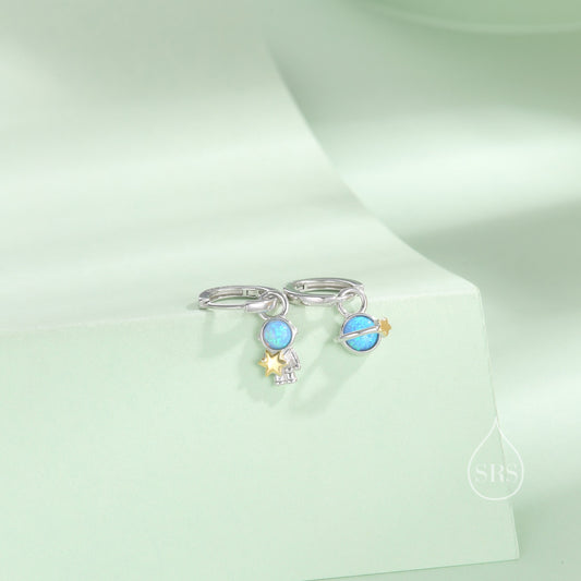 Mismatched Opal Astronaut and Planet Charmed Hoop Earrings in Sterling Silver - Cute Space Theme Huggie Hoop Earrings - Detachable Fun Hoops