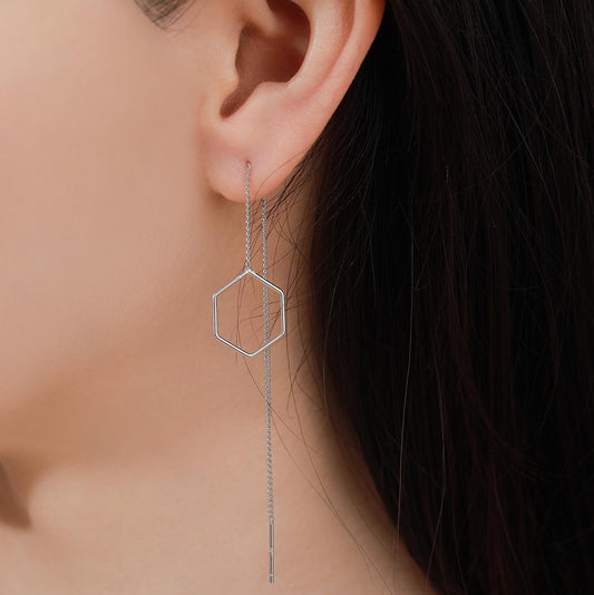 Open Hexagon Threader Earrings in Sterling Silver, Silver or Gold or Rose Gold, Chain Earrings