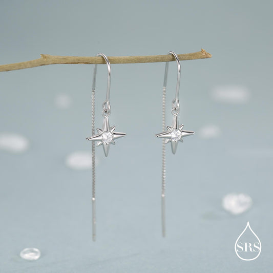 Extra Tiny CZ Starburst and Moon Threader Earrings in Sterling Silver, Silver or Gold or Rose Gold, North Star Ear Threaders, Star Threaders