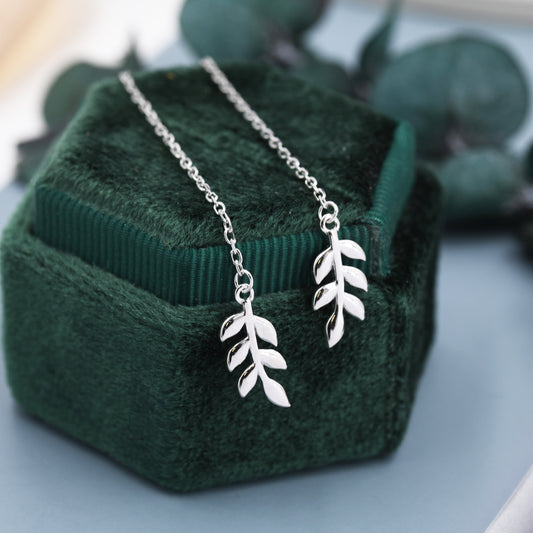 Delicate Leaf Threader Earrings in Sterling Silver, Olive Branch Earrings, Silver, Gold or Rose Gold, Long Threders