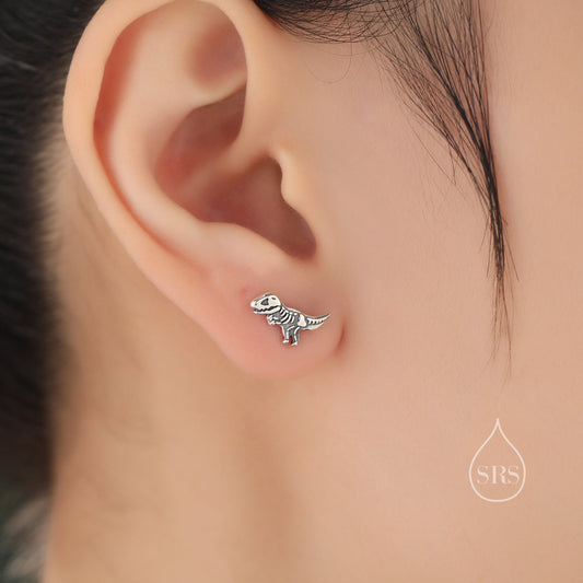 Oxidised Sterling Silver Dinosaur Fossil Stud Earrings, Oxidised Silver Finish Dino Stud, Quirky Dino Stud, Asymmetric Dinosaur Earrings,