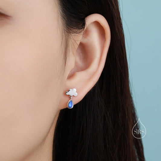 Dainty Cloud and Moonstone Raindrop Stud Earrings in Sterling Silver, Silver or Gold, Cloud Earrings, Moonstone Droplet Earrings