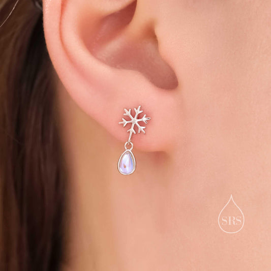 Snowflake and Moonstone Stud Earrings in Sterling Silver, Snow Earrings, Moonstone Droplet Earrings