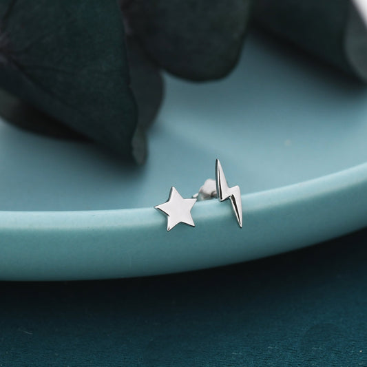 Mismatched Tiny Star and Lightning Bolt Stud Earrings in Sterling Silver, Asymmetric Extra Small Star and Lightning Bolt Fun Earrings