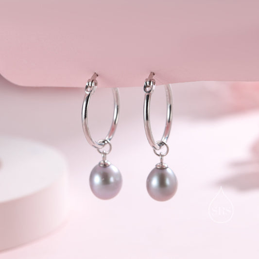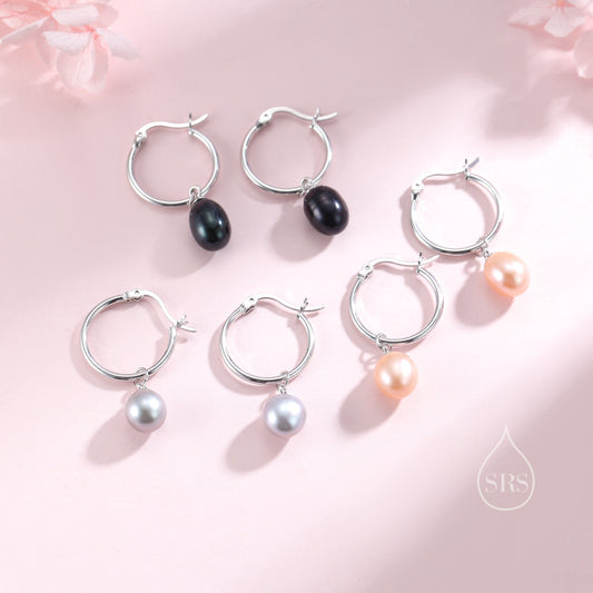 Natural Freshwater Pearl Huggie Hoop Earrings in Sterling Silver, Available in Three Colours, Grey Pearl Earrings, Black Pearl Earrings