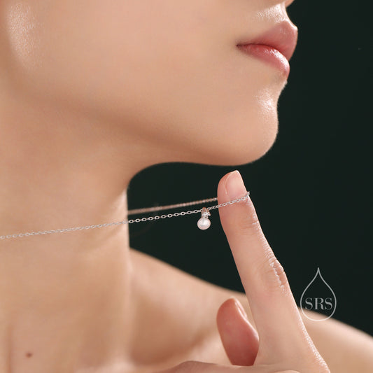 Natural Pearl and CZ Necklace in Sterling Silver with a Satellite Chain, Genuine Freshwater Pearl Pendant Necklace in Sterling Silver