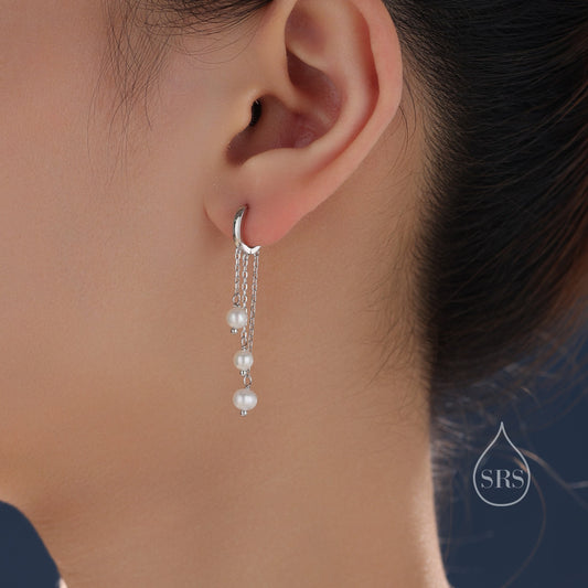 Natural Freshwater Pearl Trio Huggie Hoop Earrings in Sterling Silver, Pearl Cascade Dangle Chain Earrings, Gold and Silver